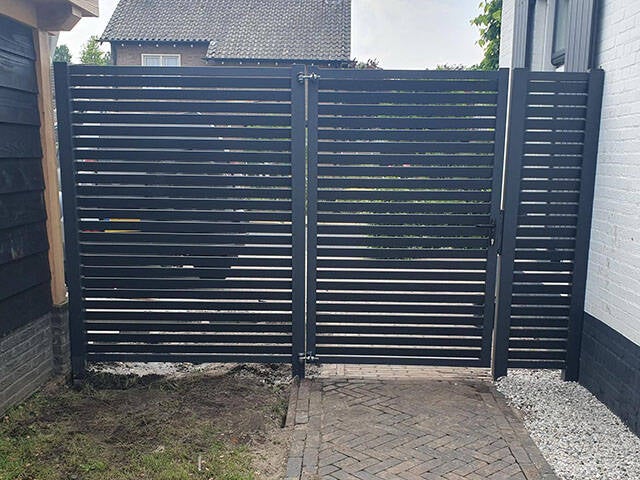 Als u kiest voor een shutters poort kiest u voor een moderne poort, geïnspireerd door de iconische louvre-deuren maar uitgevoerd in robuust metaal. Dit ontwerp is tevens beschikbaar als hekwerk waarmee u een elegante en functionele oplossing krijgt voor uw buitenruimte.