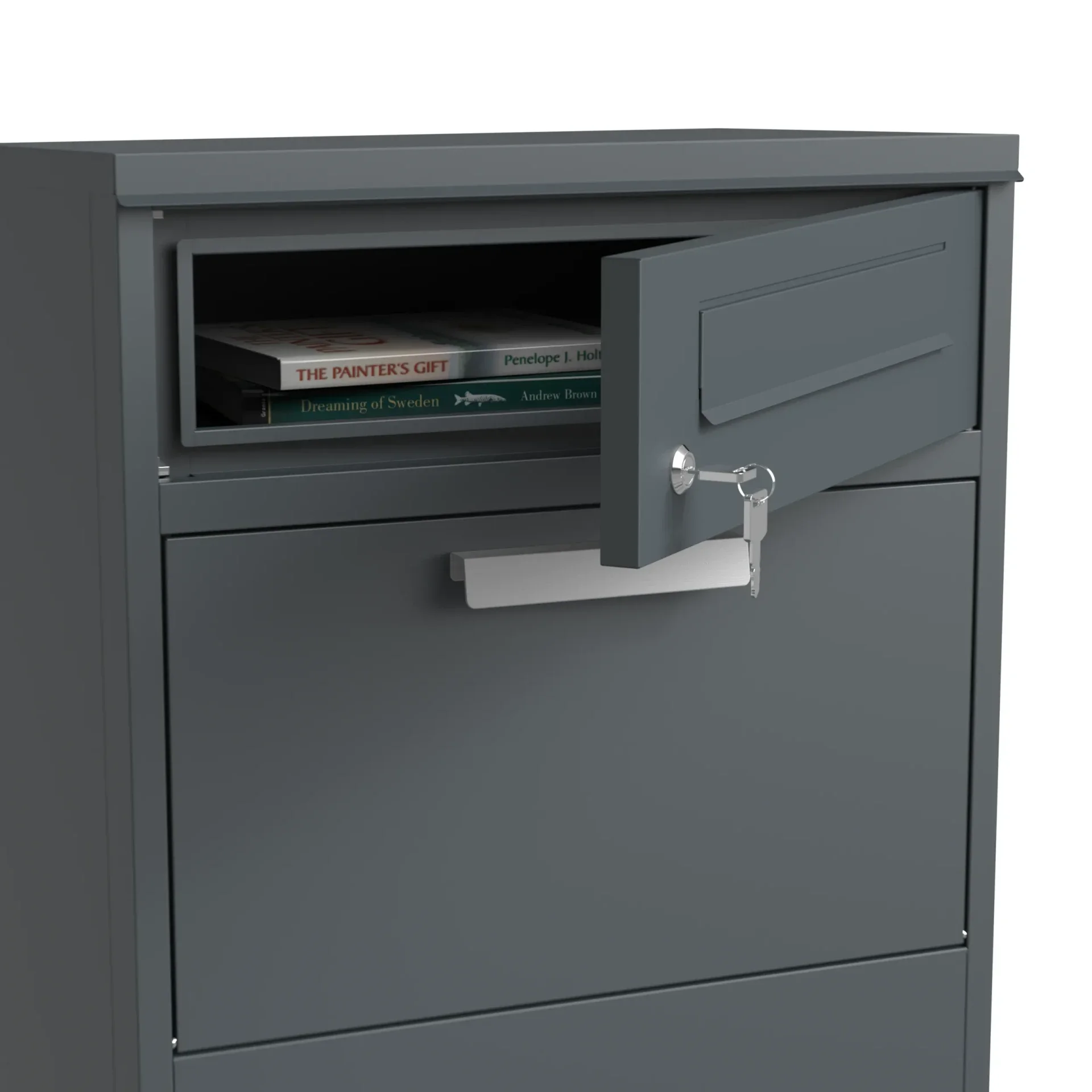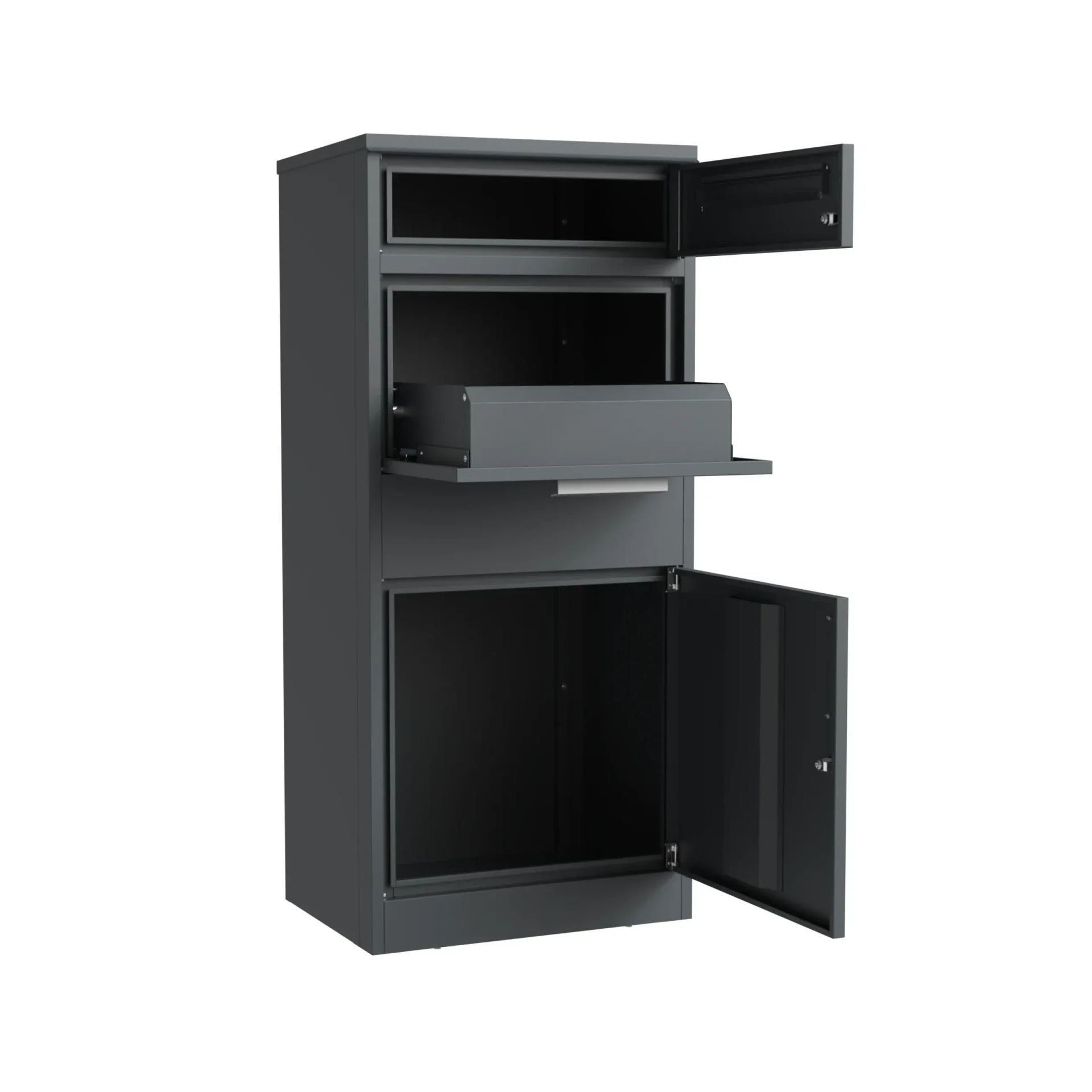 Uw pakketten worden veilig opgeborgen dankzij het slimme inworpsysteem en de afsluitbare deur. -